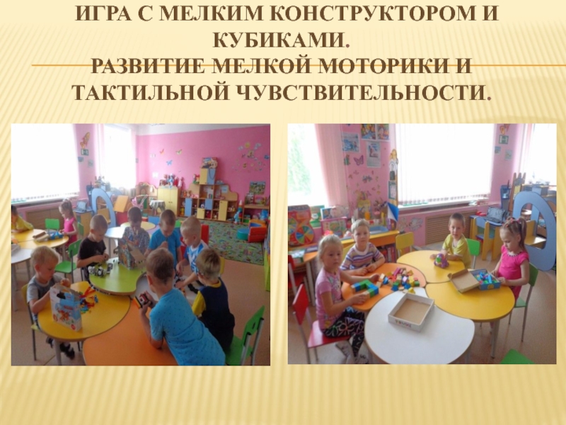 Слайд 12 Игра с мелким конструктором и кубиками.