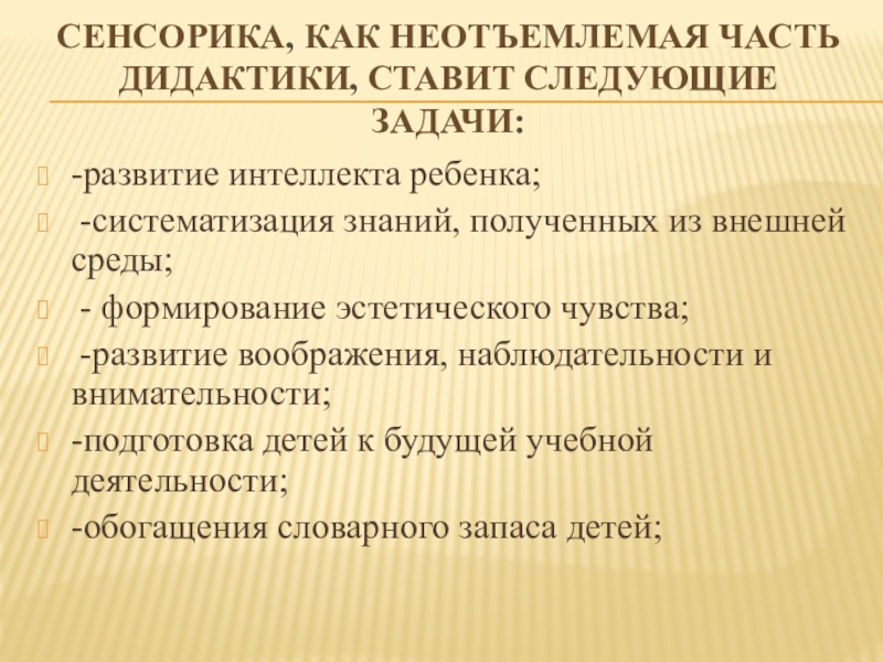 Слайд 4Сенсорика, как неотъемлемая часть дидактики, ставит следующие задачи: