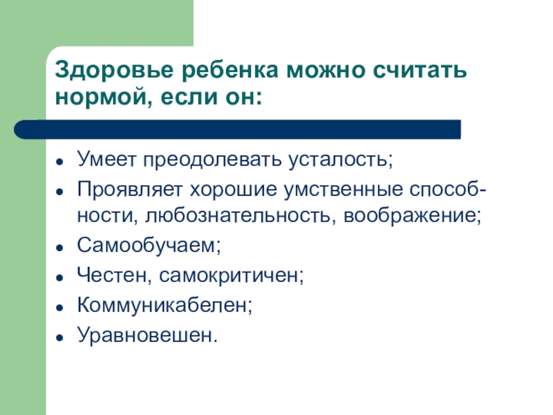 Слайд 22Здоровье ребенка можно считать нормой, если он: