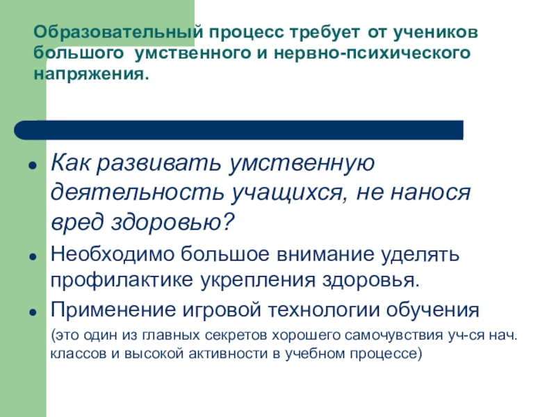 Слайд 2Образовательный процесс требует от учеников большого умственного и нервно-психического напряжения.