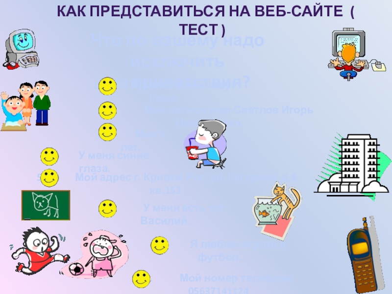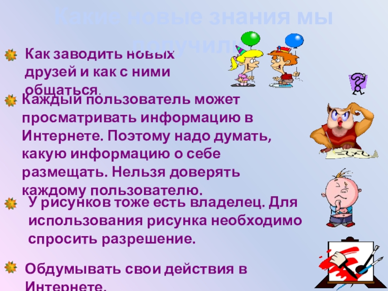 Каждый пользователь может просматривать информацию в Интернете. Поэтому надо думать, какую информацию о себе размещать. Нельзя доверять каждому пользователю.