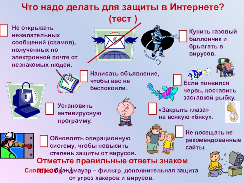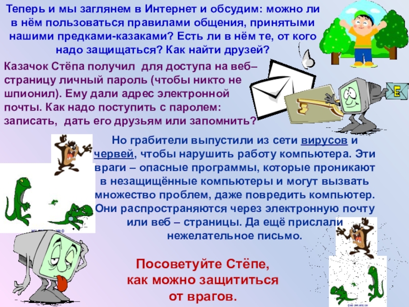 Но грабители выпустили из сети вирусов и червей, чтобы нарушить работу компьютера. Эти враги – опасные программы, которые проникают в незащищённые компьютеры и могут вызвать множество проблем, даже повредить компьютер. Они распространяются через электронную почту или веб – страницы. Да ещё прислали нежелательное письмо.