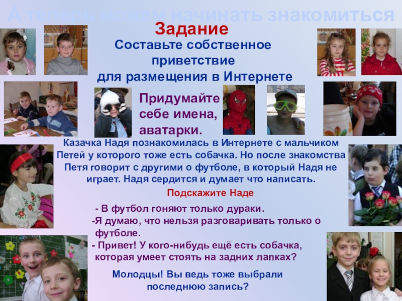 Казачка Надя познакомилась в Интернете с мальчиком Петей у которого тоже есть собачка. Но после знакомства Петя говорит с другими о футболе, в который Надя не играет. Надя сердится и думает что написать.