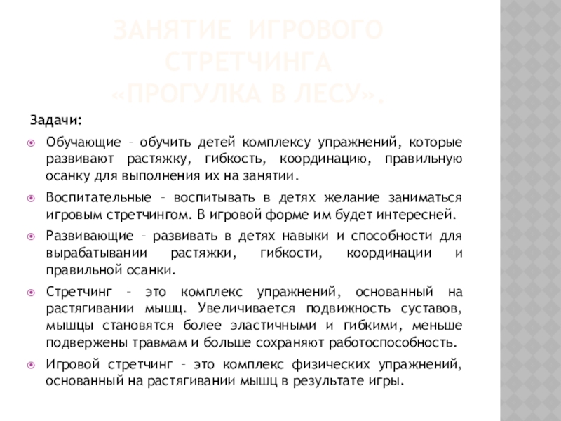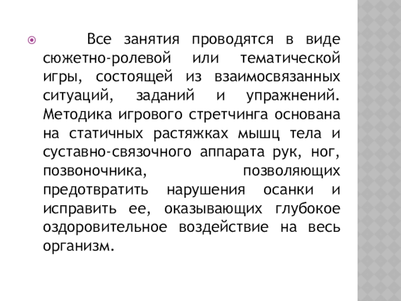 состоящей из взаимосвязанных ситуаций, заданий и упражнений. Методика игрового стретчинга основана на статичных растяжках мышц тела и суставно-связочного аппарата рук, ног, позвоночника, позволяющих предотвратить нарушения осанки и исправить ее, оказывающих глубокое оздоровительное воздействие на весь организм.