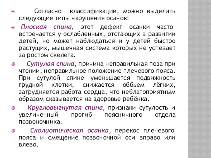 Слайд 7 Согласно классификации, можно выделить следующие типы нарушения осанок: