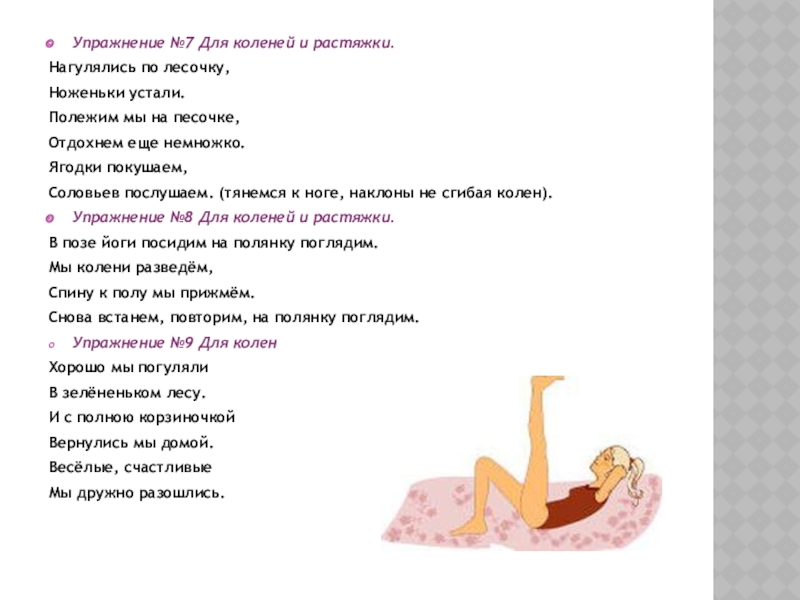 Слайд 11Упражнение №7 Для коленей и растяжки.