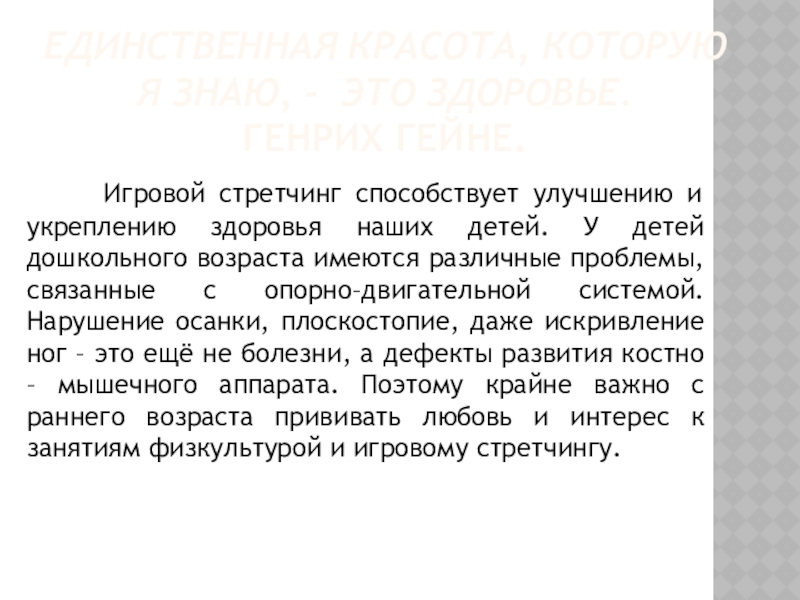 Игровой стретчинг способствует улучшению и укреплению здоровья наших детей. У детей дошкольного возраста имеются различные проблемы, связанные с опорно–двигательной системой. Нарушение осанки, плоскостопие, даже искривление ног – это ещё не болезни, а дефекты развития костно – мышечного аппарата. Поэтому крайне важно с раннего возраста прививать любовь и интерес к занятиям физкультурой и игровому стретчингу.