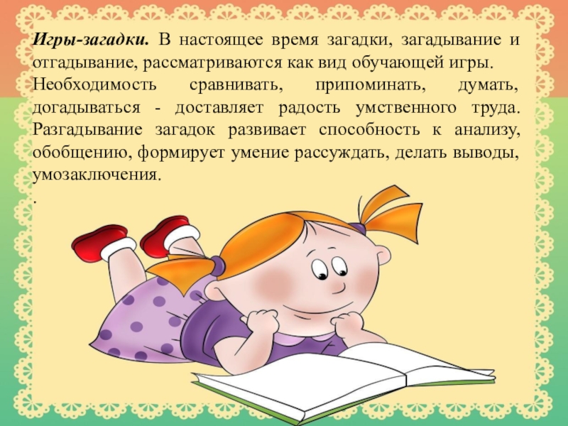 Слайд 23Игры-загадки. В настоящее время загадки, загадывание и отгадывание, рассматриваются как вид