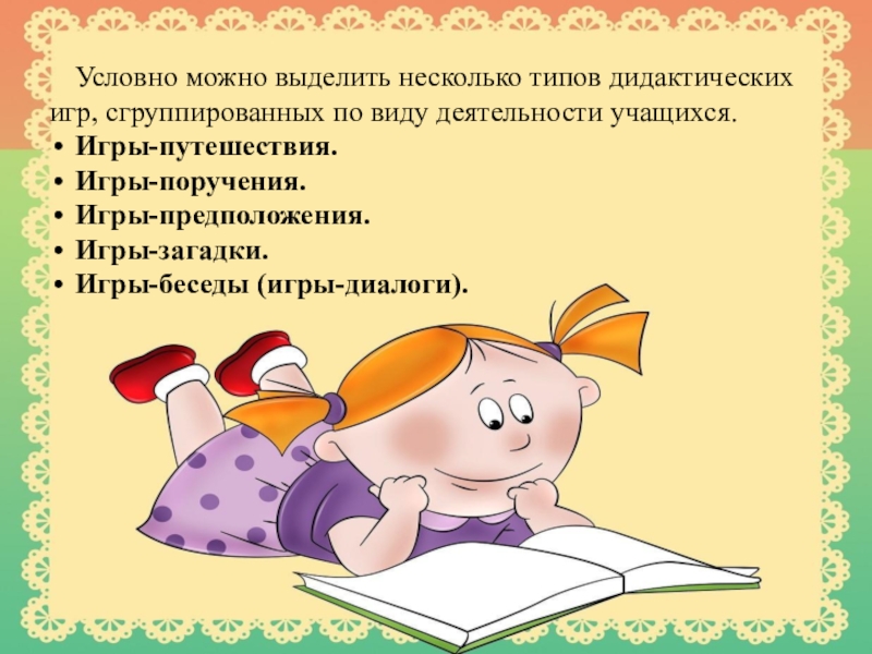 Слайд 3Условно можно выделить несколько типов дидактических игр, сгруппированных по виду деятельности
