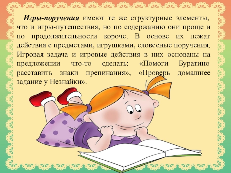 Слайд 13Игры-поручения имеют те же структурные элементы, что и игры-путешествия, но по