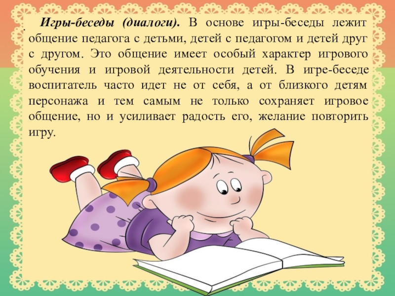 Игры-беседы (диалоги). В основе игры-беседы лежит общение педагога с детьми, детей