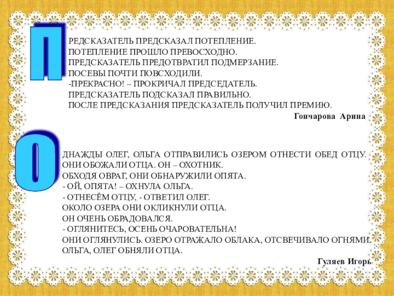 ДНАЖДЫ ОЛЕГ, ОЛЬГА ОТПРАВИЛИСЬ ОЗЕРОМ ОТНЕСТИ ОБЕД ОТЦУ. ОНИ ОБОЖАЛИ ОТЦА. ОН – ОХОТНИК.
