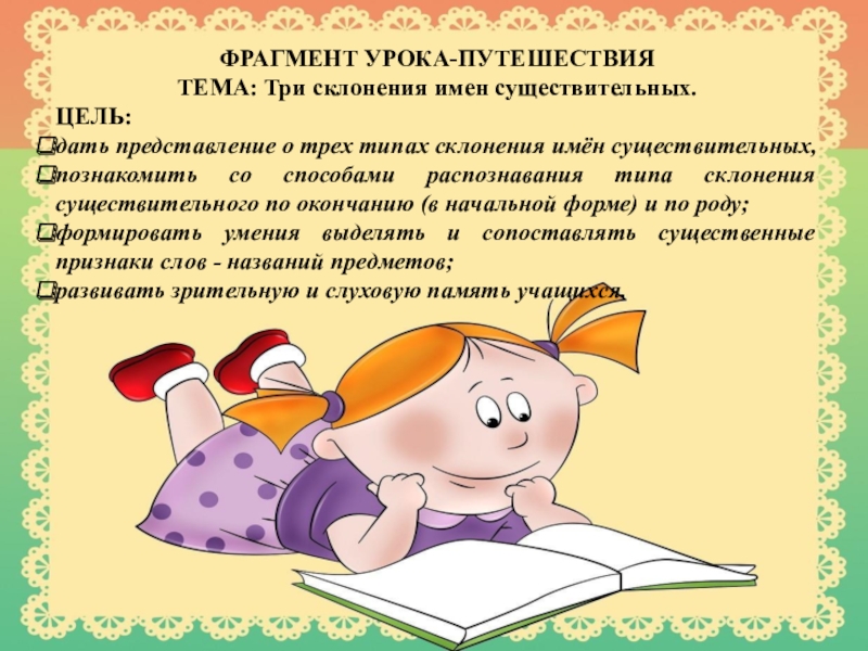познакомить со способами распознавания типа склонения существительного по окончанию (в начальной форме) и по роду;
