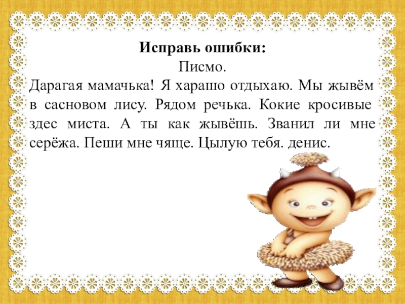 Дарагая мамачька! Я харашо отдыхаю. Мы жывём в сасновом лису.