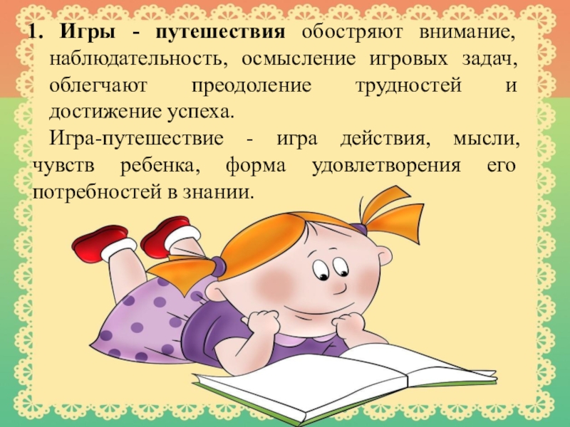 Слайд 4 Игры - путешествия обостряют внимание, наблюдательность, осмысление игровых задач, облегчают