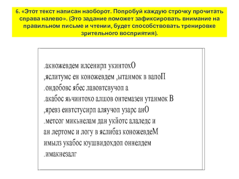6. «Этот текст написан наоборот. Попробуй каждую строчку прочитать справа налево». (Это задание поможет зафиксировать внимание на
