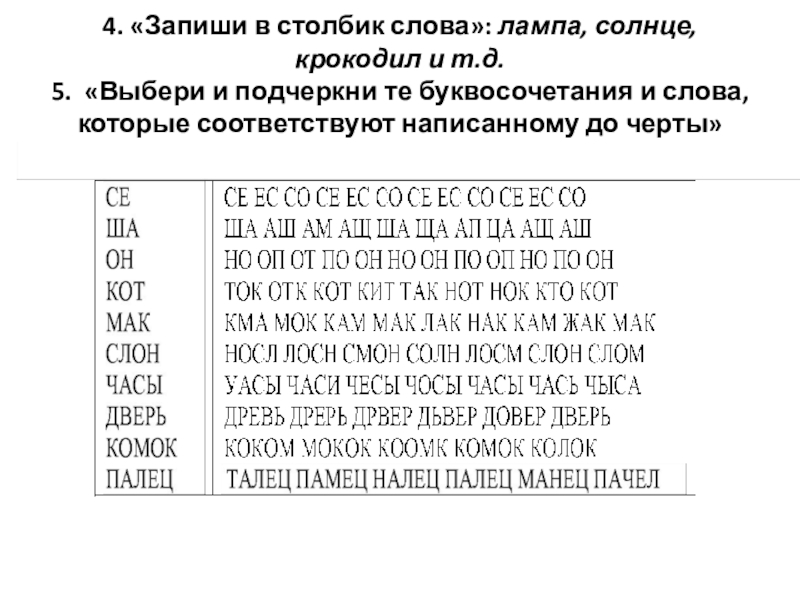 4. «Запиши в столбик слова»: лампа, солнце, крокодил и т.д. 5. «Выбери и подчеркни те буквосочетания и