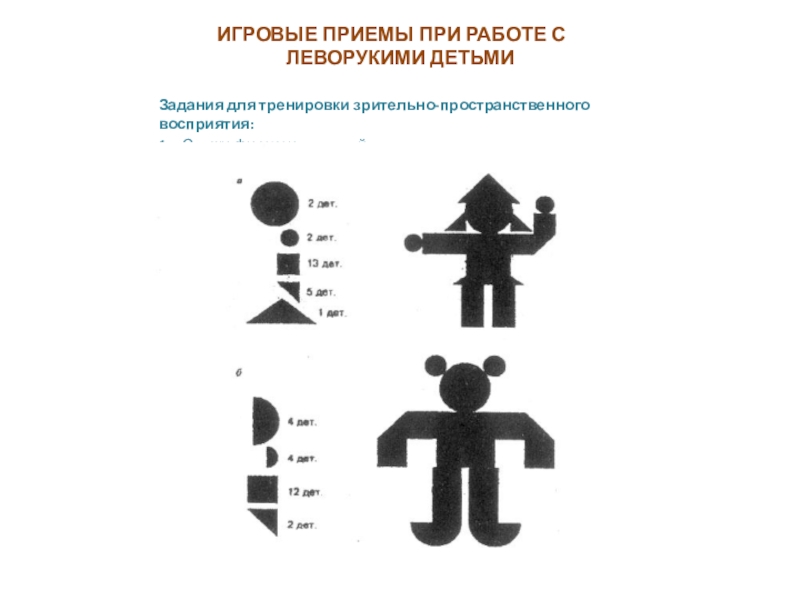 ИГРОВЫЕ ПРИЕМЫ ПРИ РАБОТЕ С    ЛЕВОРУКИМИ ДЕТЬМИ Задания для тренировки зрительно-пространственного восприятия:1. «Сложи фигуру