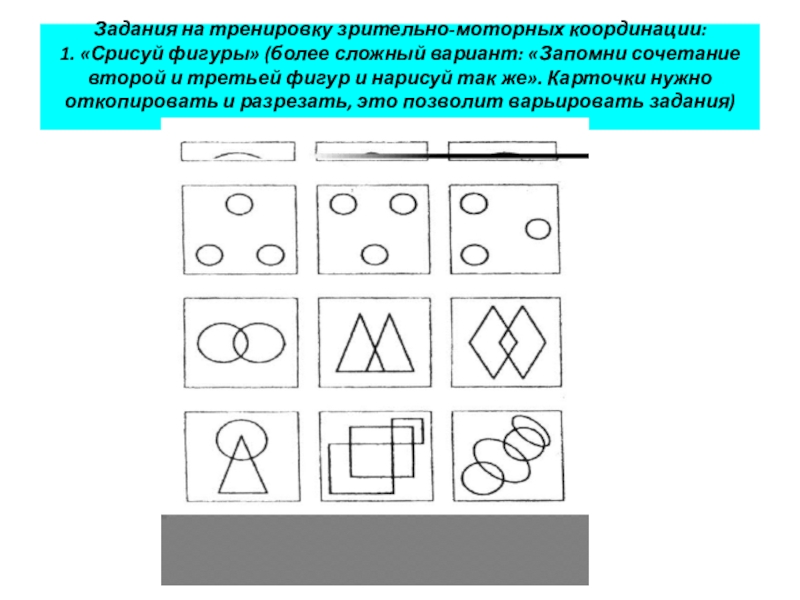 Слайд 10Задания на тренировку зрительно-моторных координации: 1. «Срисуй фигуры» (более сложный вариант: «Запомни