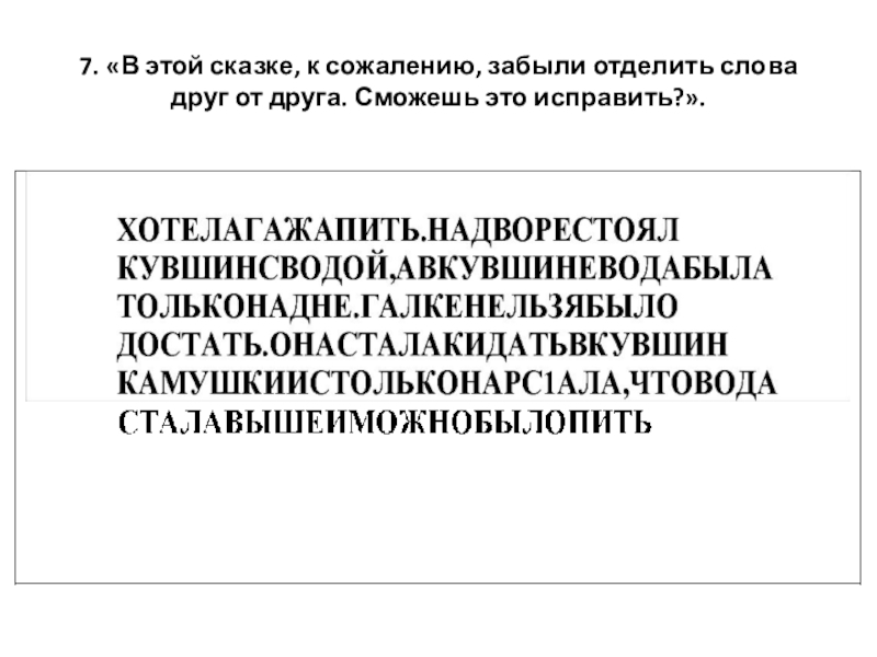 Слайд 8  7. «В этой сказке, к сожалению, забыли отделить слова друг от