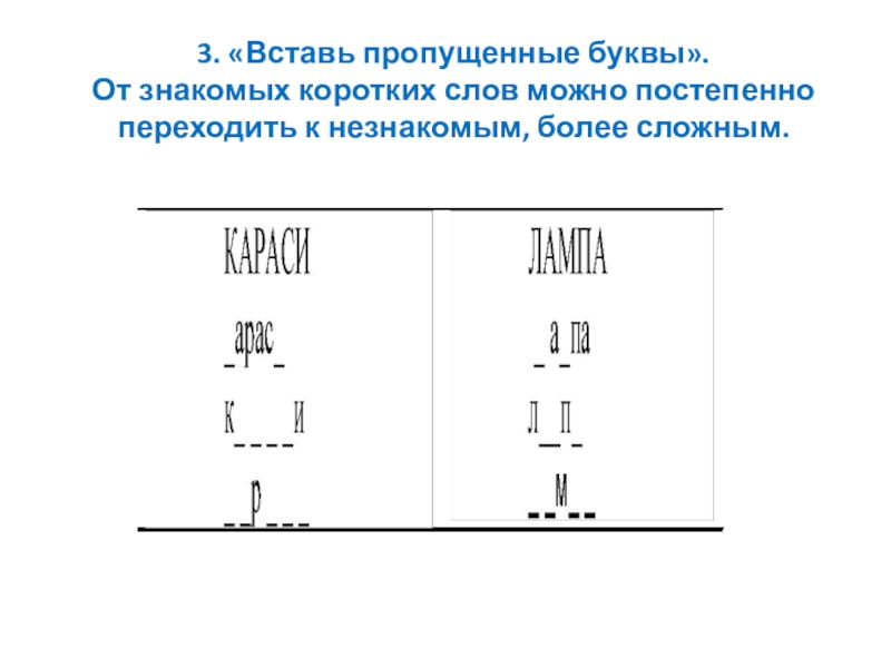 3. «Вставь пропущенные буквы». От знакомых коротких слов можно постепенно переходить к незнакомым, более сложным.