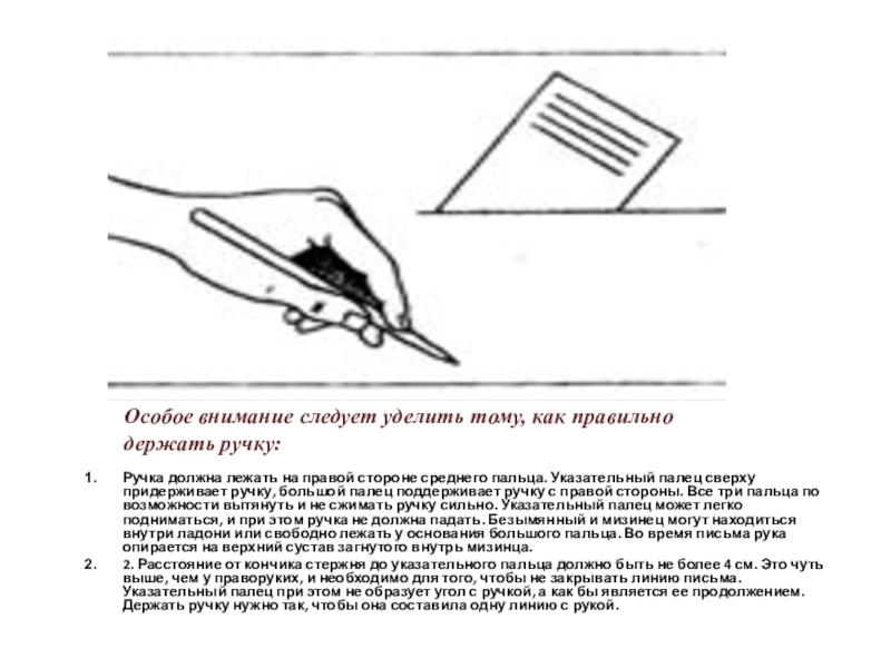 Слайд 2Особое внимание следует уделить тому, как правильно держать ручку: