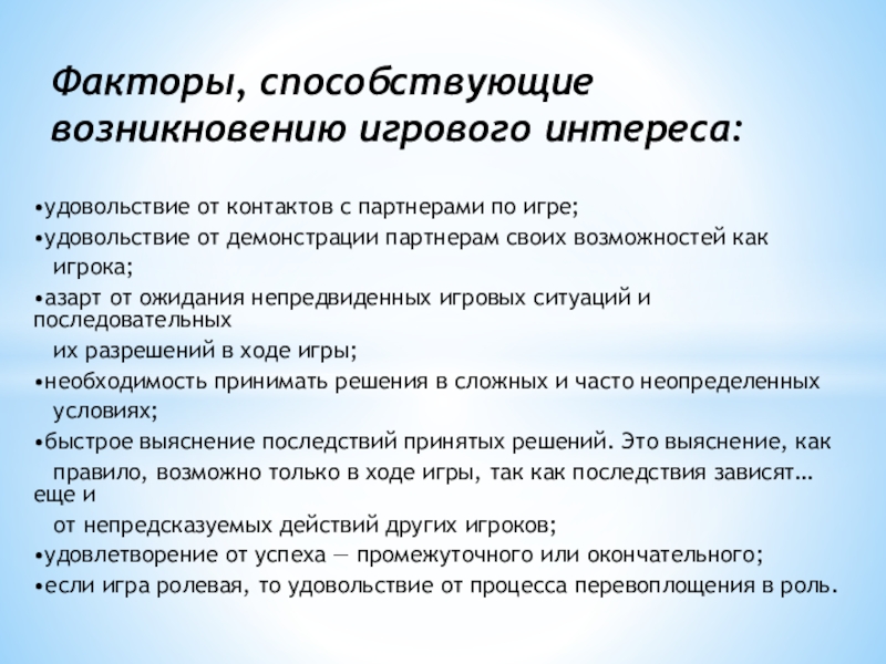 Факторы, способствующие возникновению игрового интереса: