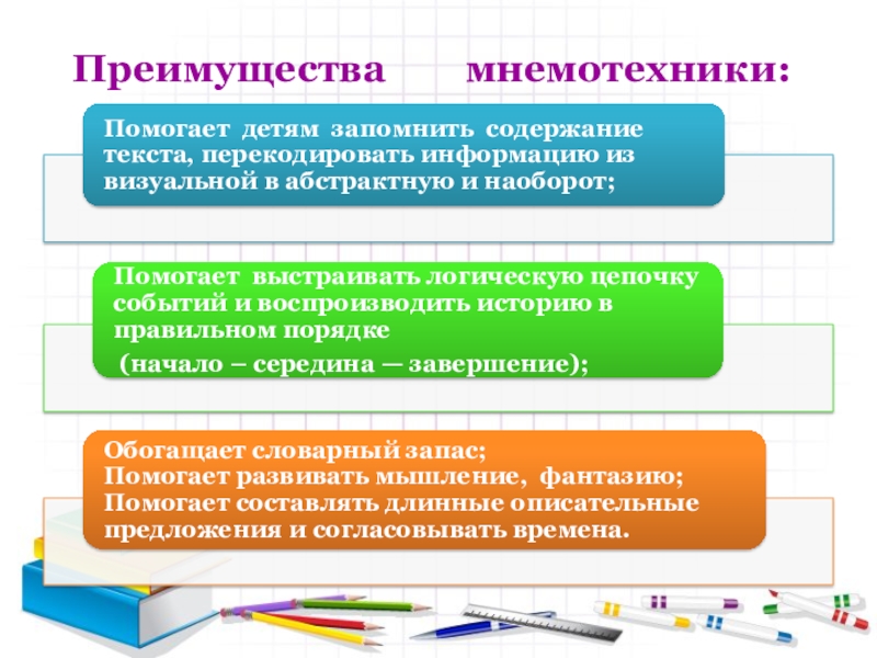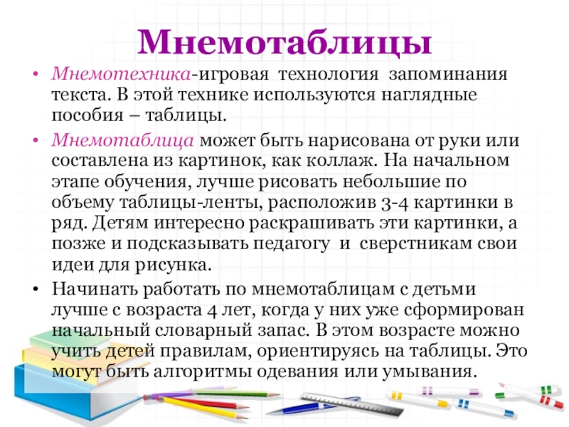 Мнемотехника-игровая технология запоминания текста. В этой технике используются наглядные пособия –