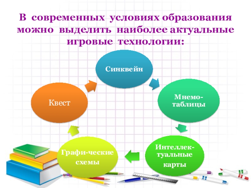 Слайд 3В современных условиях образования можно выделить наиболее актуальные игровые технологии:
