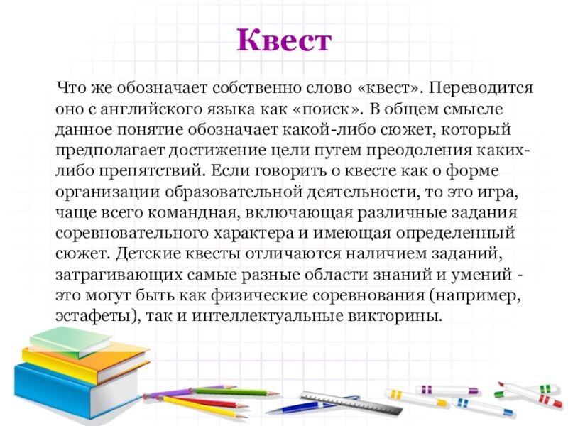 как «поиск». В общем смысле данное понятие обозначает какой-либо сюжет, который предполагает достижение цели путем преодоления каких-либо препятствий. Если говорить о квесте как о форме организации образовательной деятельности, то это игра, чаще всего командная, включающая различные задания соревновательного характера и имеющая определенный сюжет. Детские квесты отличаются наличием заданий, затрагивающих самые разные области знаний и умений - это могут быть как физические соревнования (например, эстафеты), так и интеллектуальные викторины.