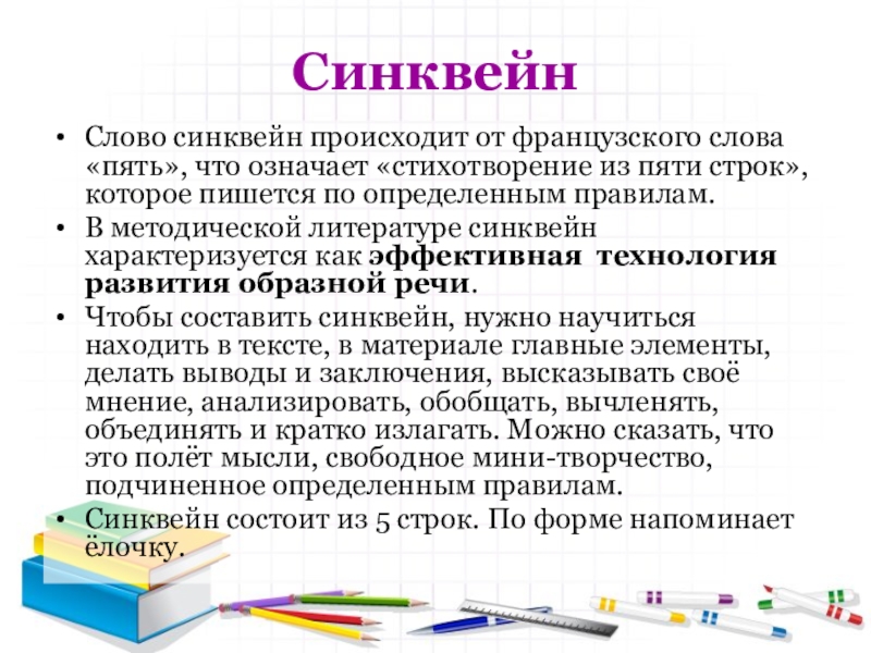 В методической литературе синквейн характеризуется как эффективная технология развития образной речи.