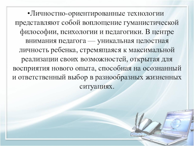 Слайд 22Личностно-ориентированные технологии представляют собой воплощение гуманистической философии, психологии и педагогики. В