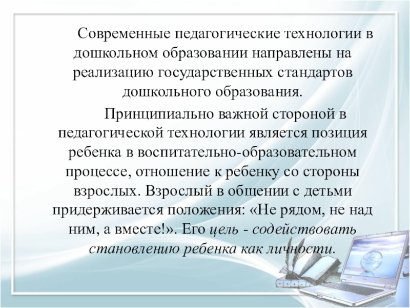 Принципиально важной стороной в педагогической технологии является позиция ребенка в воспитательно-образовательном процессе, отношение к ребенку со стороны взрослых. Взрослый в общении с детьми придерживается положения: «Не рядом, не над ним, а вместе!». Его цель - содействовать становлению ребенка как личности.