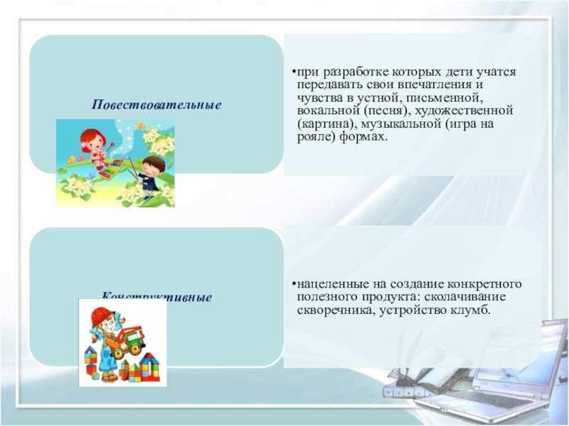 Мультимедийные презентации — это наглядность, дающая возможность педагогу выстроить объяснение с использованием видеофрагментов. Информационно-обучающие программы для дошкольников позволяют моделировать и наглядно демонстрировать содержание изучаемых тем. Тестирующие программы могут быть использованы для психолого-педагогической оценки развития детей дошкольного возраста.