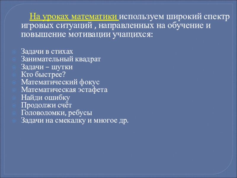 Слайд 7 На уроках математики используем широкий спектр игровых
