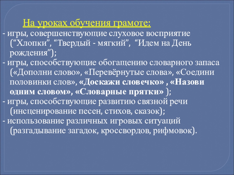 - игры, способствующие обогащению словарного запаса («Дополни слово», «Перевёрнутые слова», «Соедини половинки слов», «Доскажи словечко» , «Назови одним словом», «Словарные прятки» );