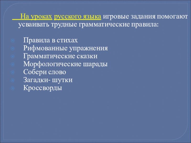 Слайд 11 На уроках русского языка игровые задания помогают усваивать