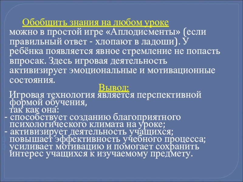 можно в простой игре «Аплодисменты» (если правильный ответ - хлопают в ладоши). У ребёнка появляется явное стремление не попасть впросак. Здесь игровая деятельность активизирует эмоциональные и мотивационные состояния.