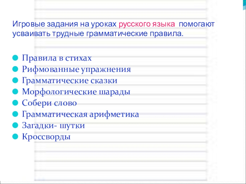 Слайд 26Игровые задания на уроках русского языка помогают усваивать трудные грамматические правила.