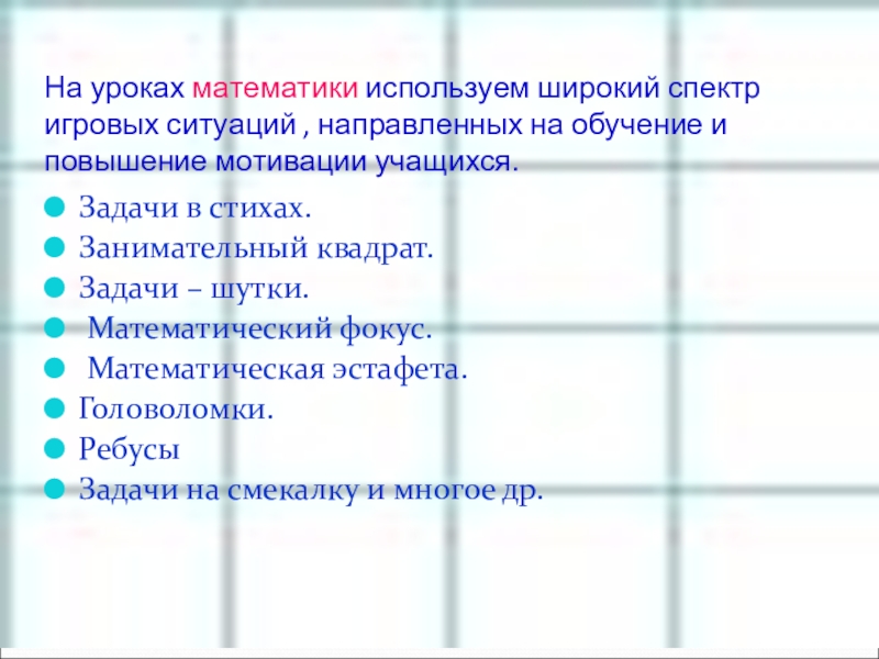 Слайд 20На уроках математики используем широкий спектр игровых ситуаций , направленных на