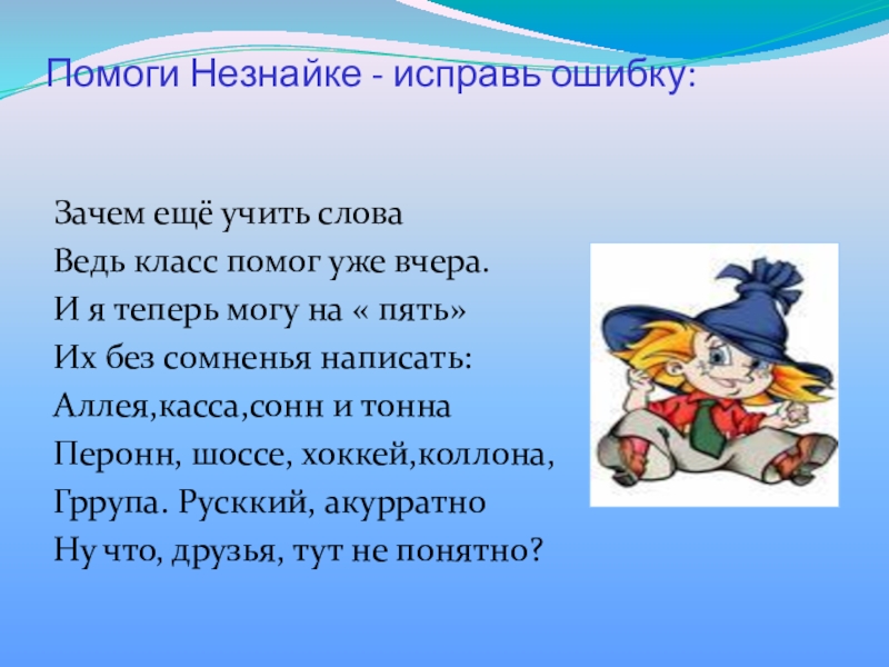 Слайд 31Помоги Незнайке - исправь ошибку: