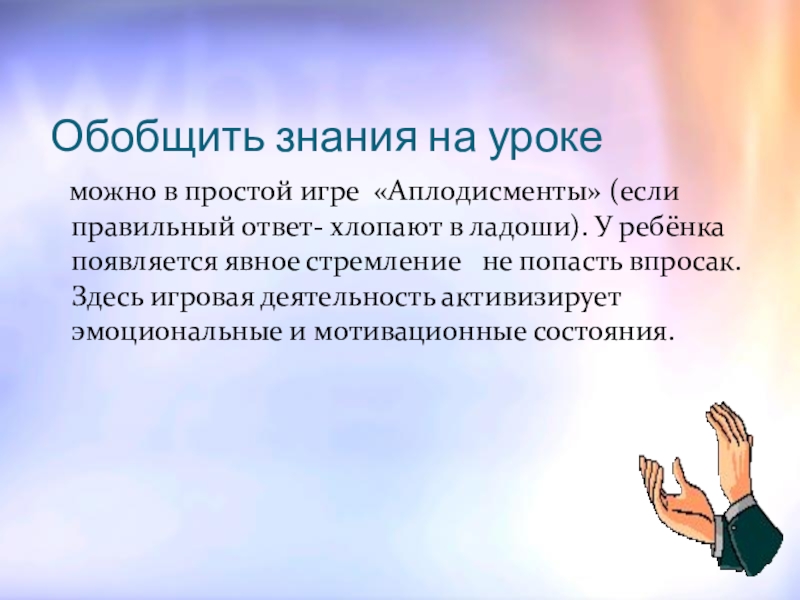 (если правильный ответ- хлопают в ладоши). У ребёнка появляется явное стремление не попасть впросак. Здесь игровая деятельность активизирует эмоциональные и мотивационные состояния.