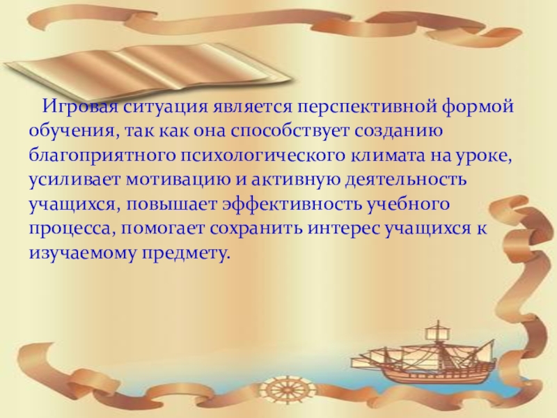 Слайд 12 Игровая ситуация является перспективной формой обучения, так как