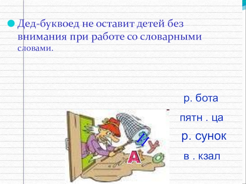 Слайд 34Дед-буквоед не оставит детей без внимания при работе со словарными словами.