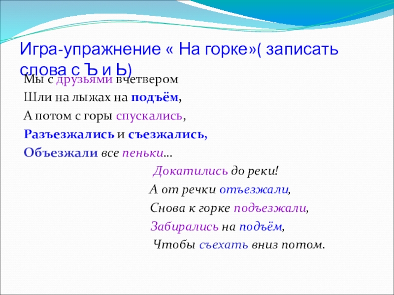 Слайд 30Игра-упражнение « На горке»( записать слова с Ъ и Ь)