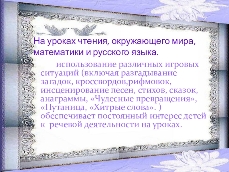 использование различных игровых ситуаций (включая разгадывание загадок, кроссвордов,рифмовок, инсценирование песен, стихов, сказок, анаграммы, «Чудесные превращения», «Путаница, «Хитрые слова». ) обеспечивает постоянный интерес детей к речевой деятельности на уроках.