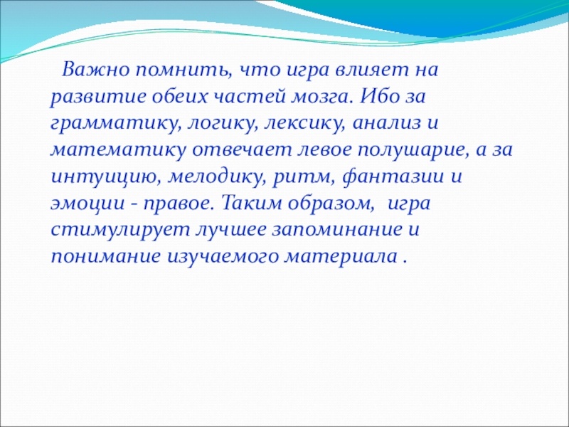 частей мозга. Ибо за грамматику, логику, лексику, анализ и математику отвечает левое полушарие, а за интуицию, мелодику, ритм, фантазии и эмоции - правое. Таким образом, игра стимулирует лучшее запоминание и понимание изучаемого материала .