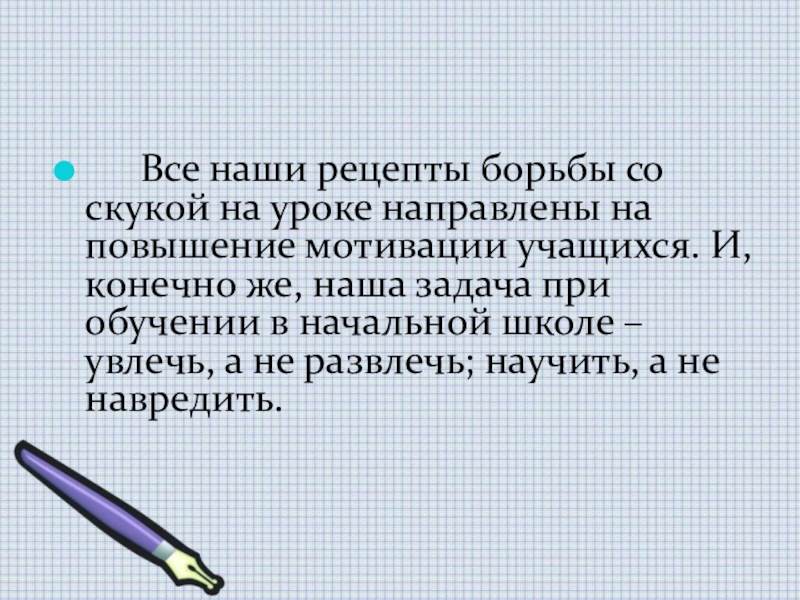 уроке направлены на повышение мотивации учащихся. И, конечно же, наша задача при обучении в начальной школе – увлечь, а не развлечь; научить, а не навредить.