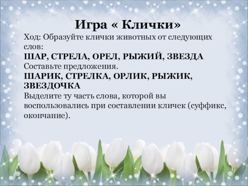 Ход: Образуйте клички животных от следующих слов: