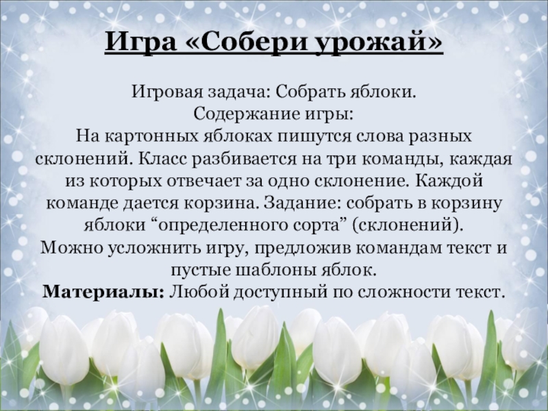 разных склонений. Класс разбивается на три команды, каждая из которых отвечает за одно склонение. Каждой команде дается корзина. Задание: собрать в корзину яблоки “определенного сорта” (склонений).